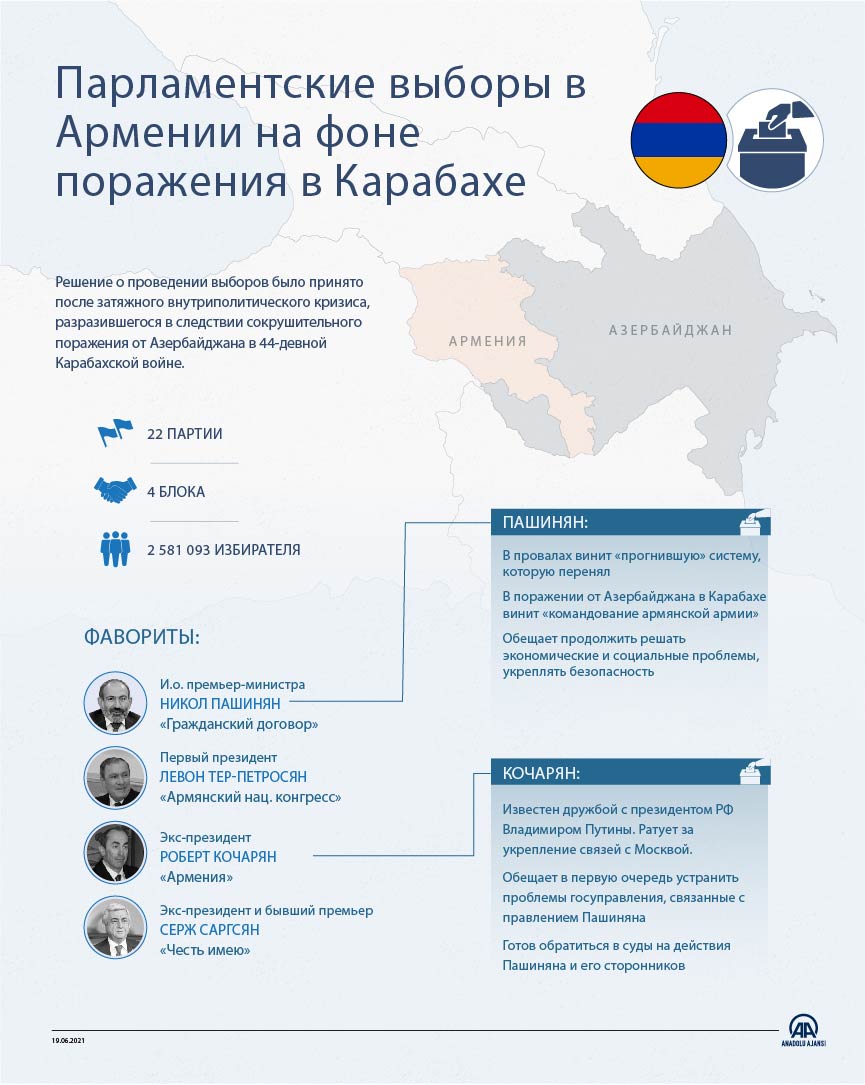 В выборах принимают участие кандидаты от более чем двух десятков политических партий и блоков, в том числе партия и.о. премьера страны Никола Пашиняна «Гражданский договор» и блок экс-президента (1998-2008) Роберта Кочаряна «Армения», которые, согласно социологическим исследованиям, являются фаворитами.